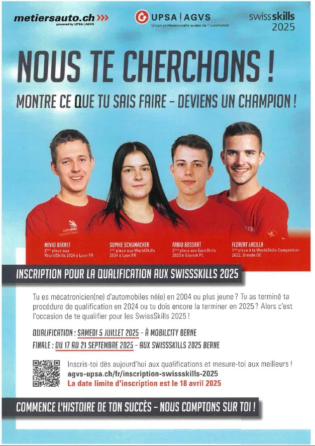 - SwissSkills : 17 au 21 septembre 2025 – Inscription : agvs-upsa.ch/fr/inscription-swissskills-2025 (dernier délai d’inscription le 18.04.2025)